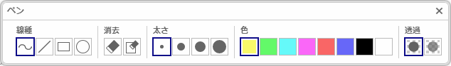 ペンの太さ、色、透明度を選んで、カタログ上に、図形を書いたり、自由曲線を引くことができます。 また消しゴムを使うことで追加した線を消すことができます。