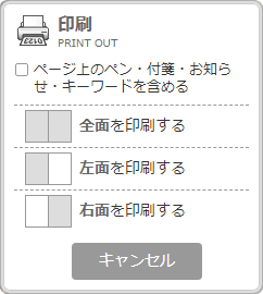 現状表示されているページを印刷できます。全面、左面、右面から選ぶことができます。全面を選択の際は、左・右ページまとめて印刷されます。