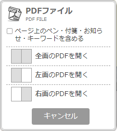 表示されているページをPDF形式でダウンロードできます。全面、左面、右面から選ぶことができます。PDFダウンロード時に「ページ上のペン・付箋・お知らせ・キーワードを含める」にチェックを入れることで、付箋・ペン・お知らせ・検索キーワードのハイライトがPDFに反映されます。