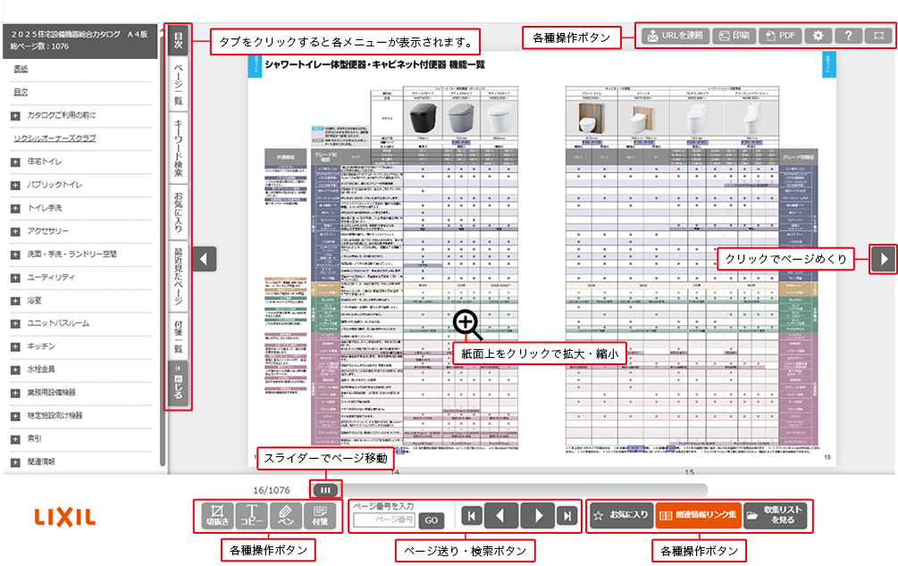 カタログの全ページをサムネイル画像で表示します。画像をクリックすると該当ページを表示します。